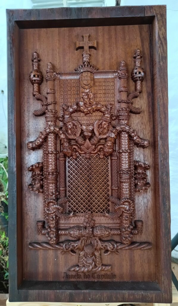 Escultura em madeira nobre entalhada, inspirada na icónica Janela do Convento de Cristo, em Tomar — uma das maiores obras do estilo manuelino português.
