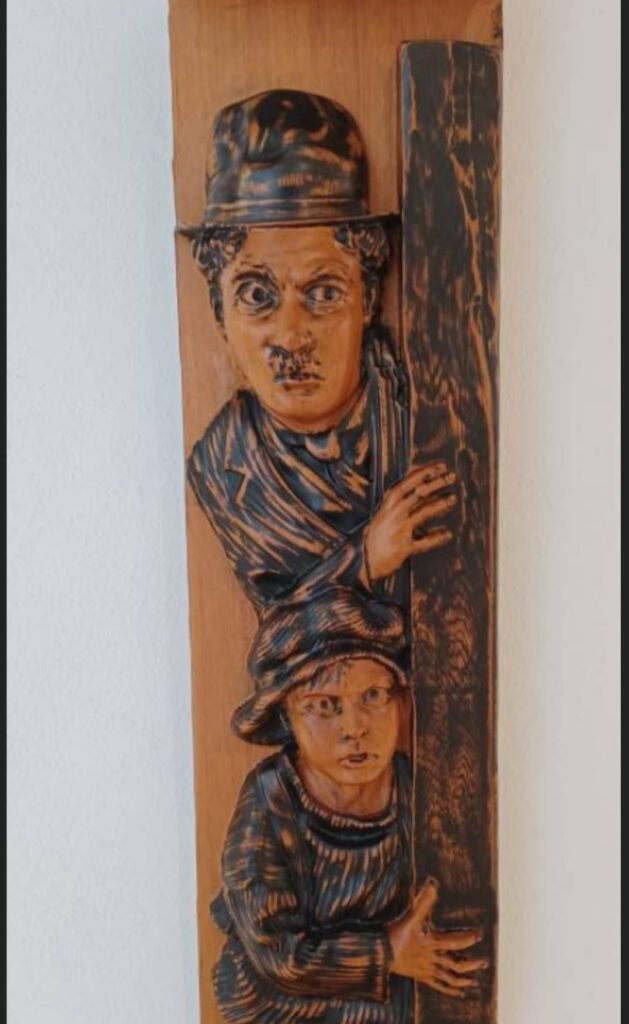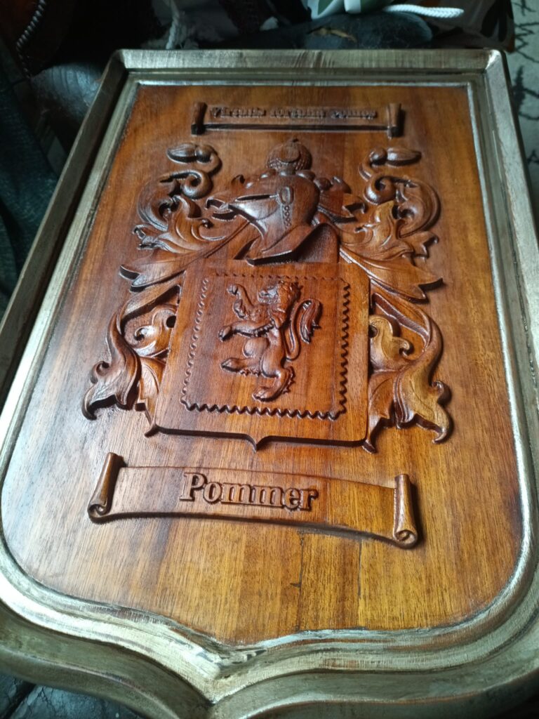 O relevo detalhado e o acabamento manual realçam a profundidade da madeira, enquanto a moldura integrada na própria peça confere robustez e elegância.