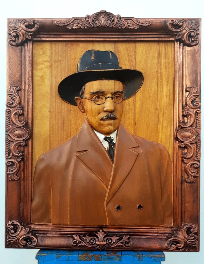 Peça artística esculpida em madeira representando Fernando Pessoa, uma das maiores figuras da literatura portuguesa.