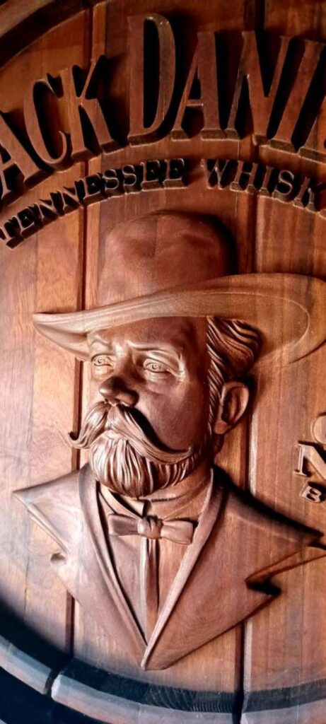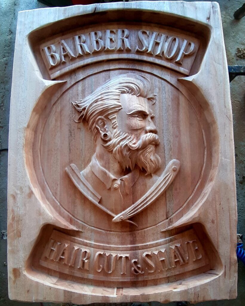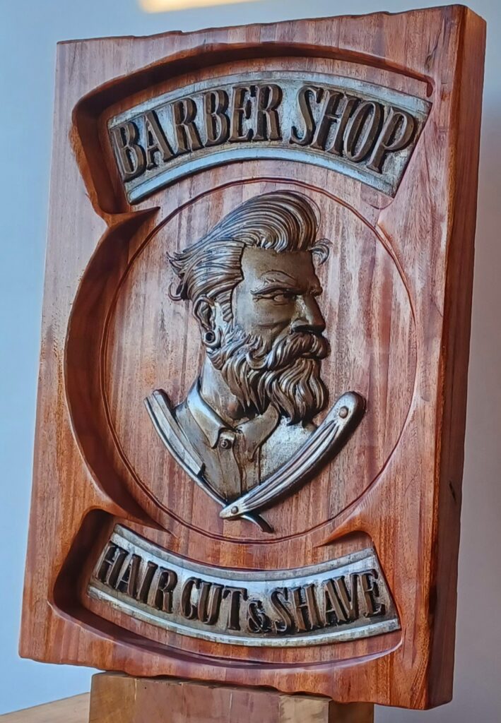 Escultura artesanal em madeira entalhada, inspirada no estilo clássico das barbearias tradicionais.