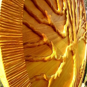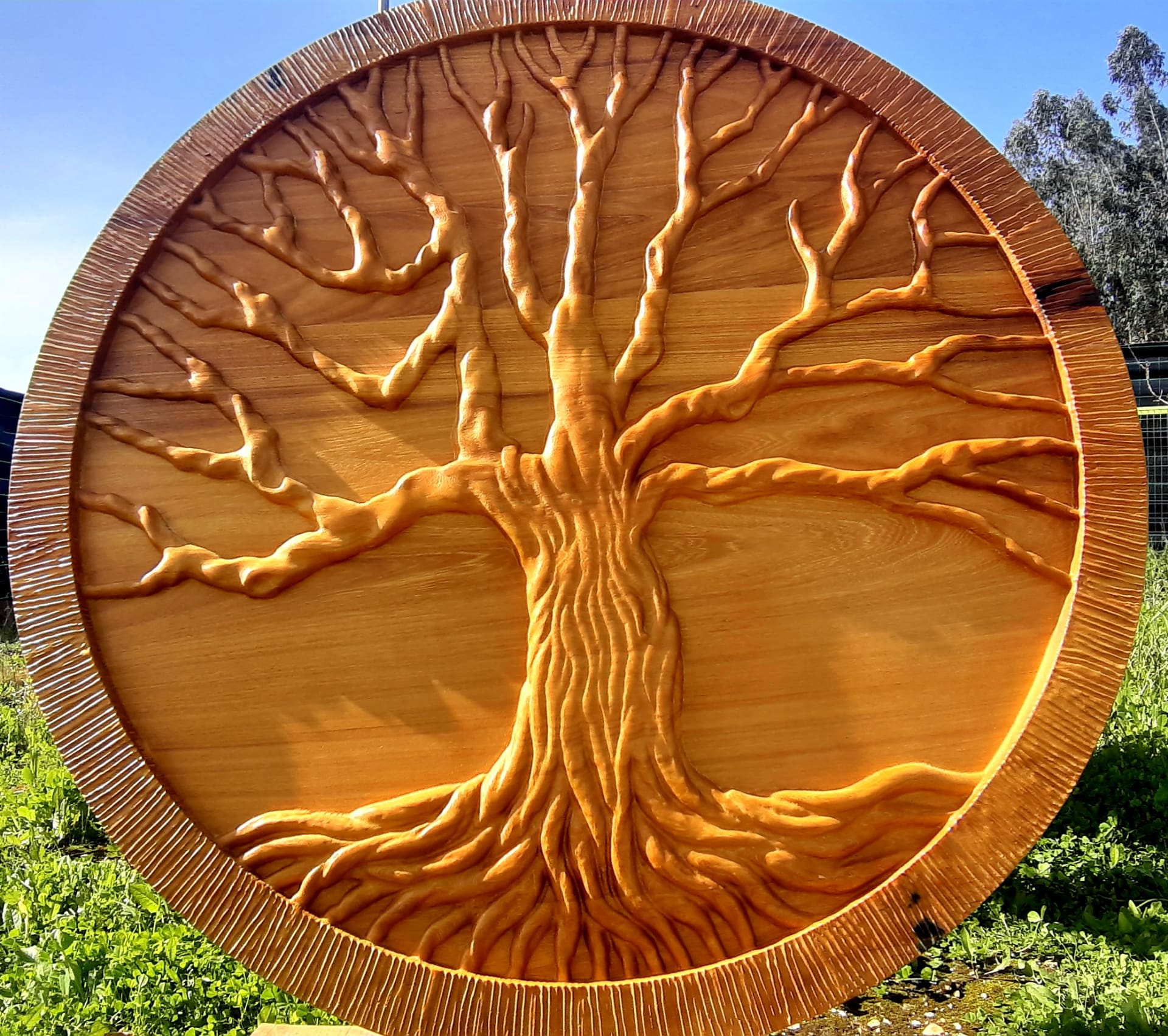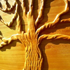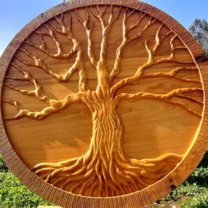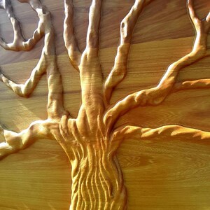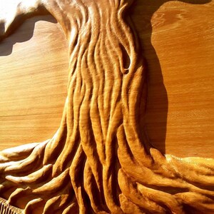 A composição em relevo realça os ramos e raízes entrelaçados, evocando equilíbrio, força, renascimento e conexão com a natureza.