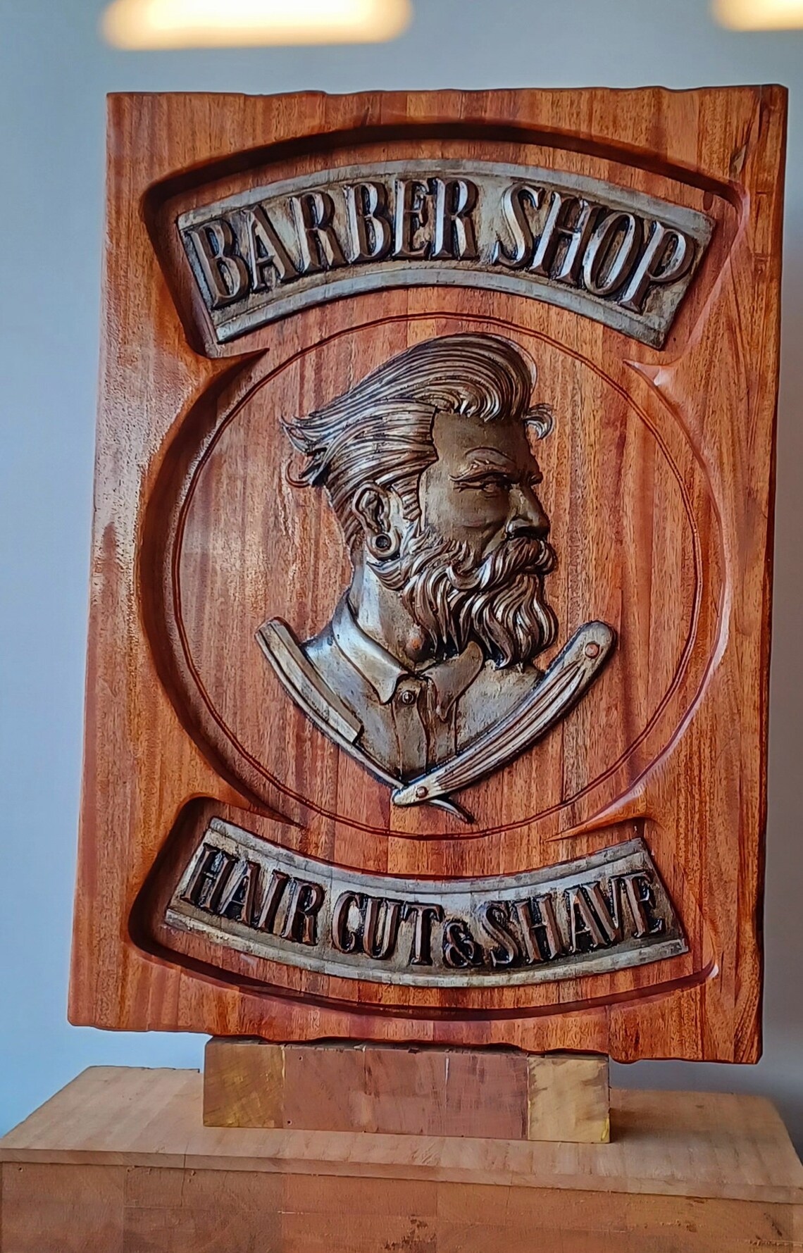 Com inspiração no universo clássico das barbearias vintage, esta escultura representa o icónico símbolo “Barber Shop” numa peça trabalhada em relevo, com moldura integrada esculpida na mesma madeira.