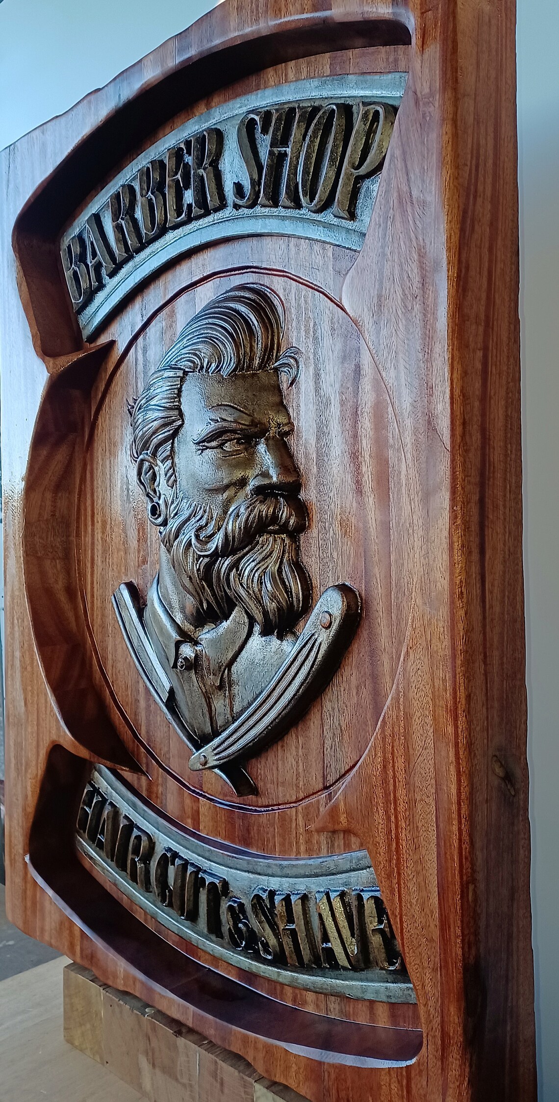 Produzida em madeira exótica africana centenária e acabada à mão, esta obra é ideal para decoração de barbearias, salões, espaços temáticos ou até mesmo colecionadores de arte retro com bom gosto.