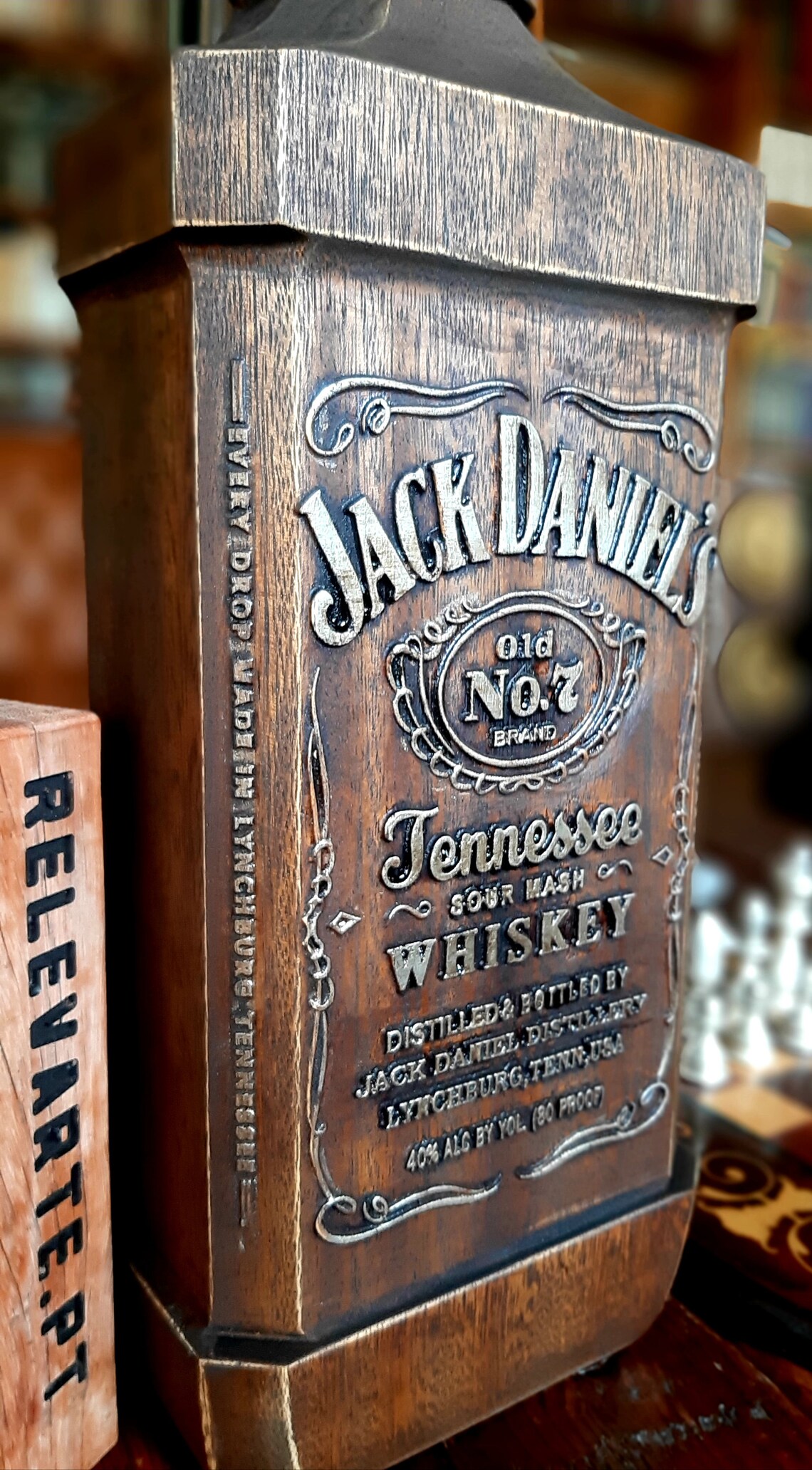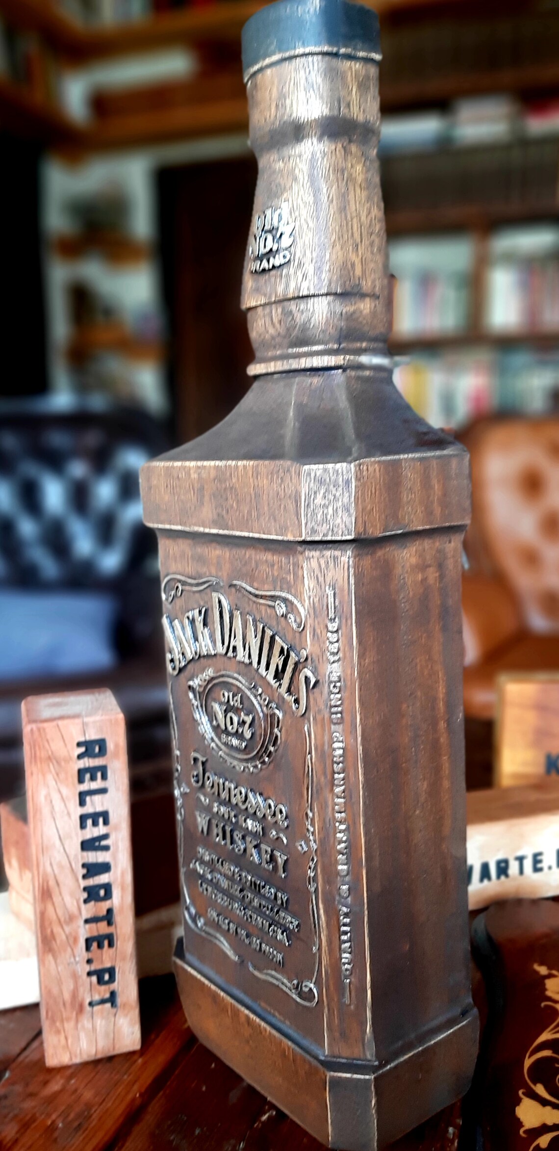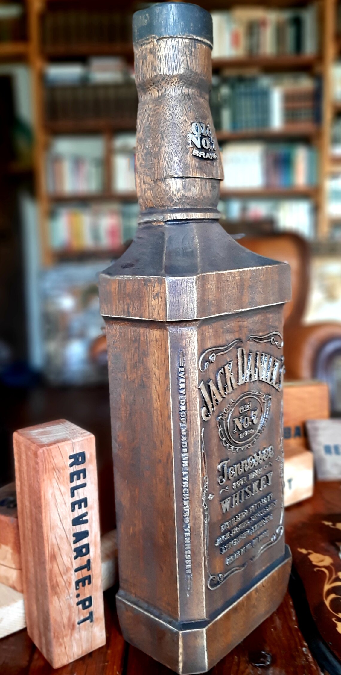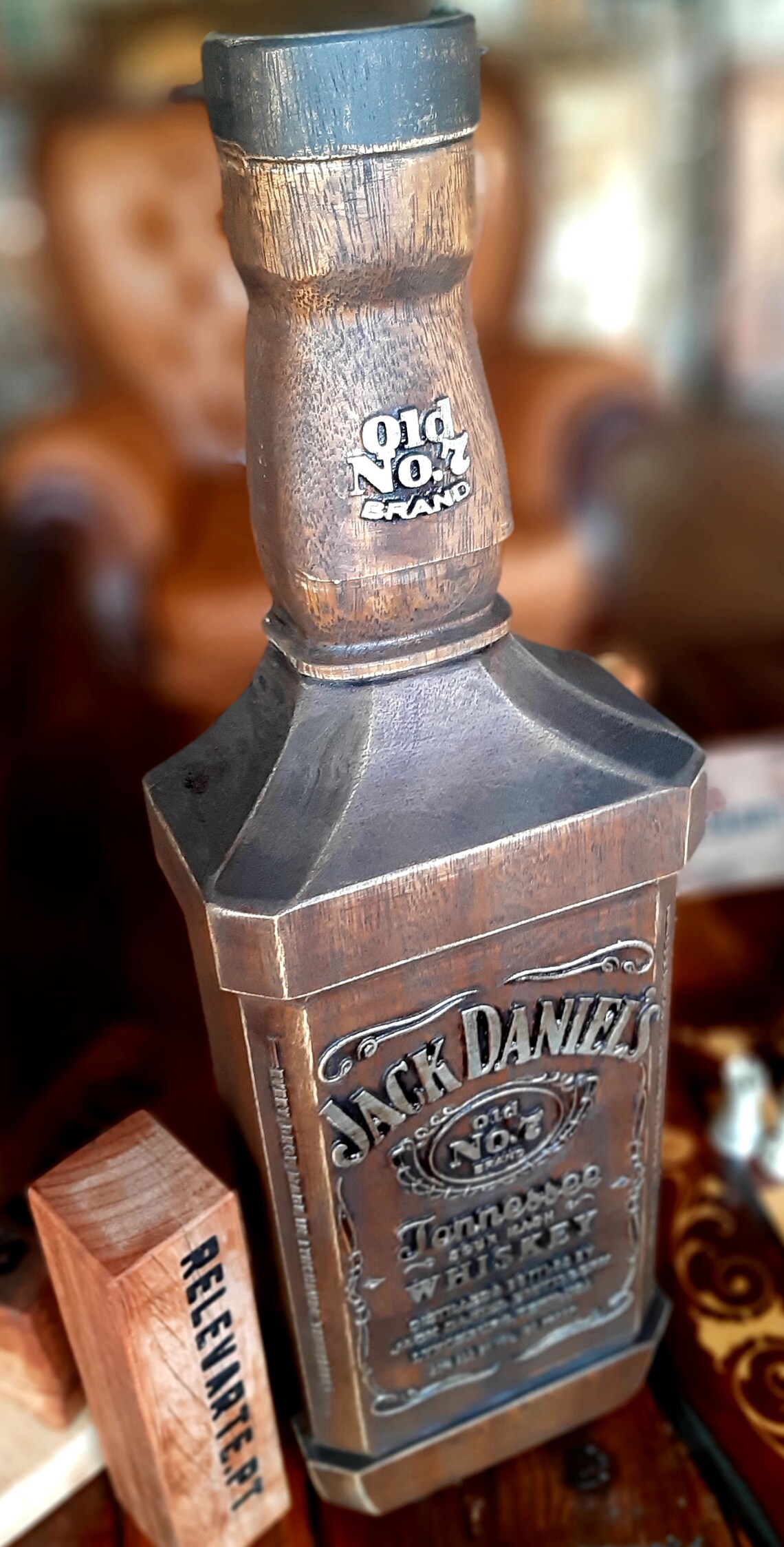 Escultura decorativa em madeira inspirada no icónico design da garrafa Jack Daniel’s.