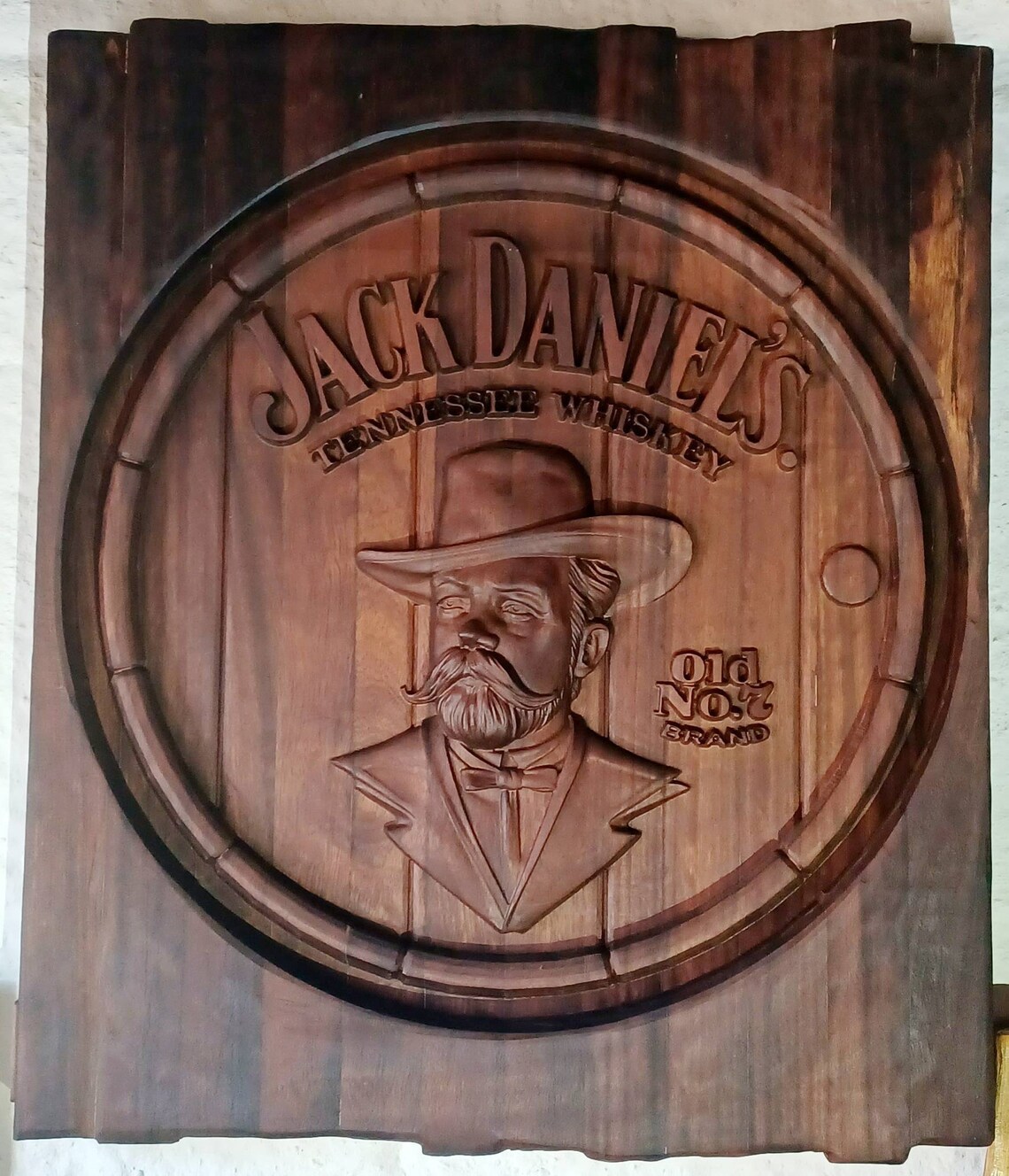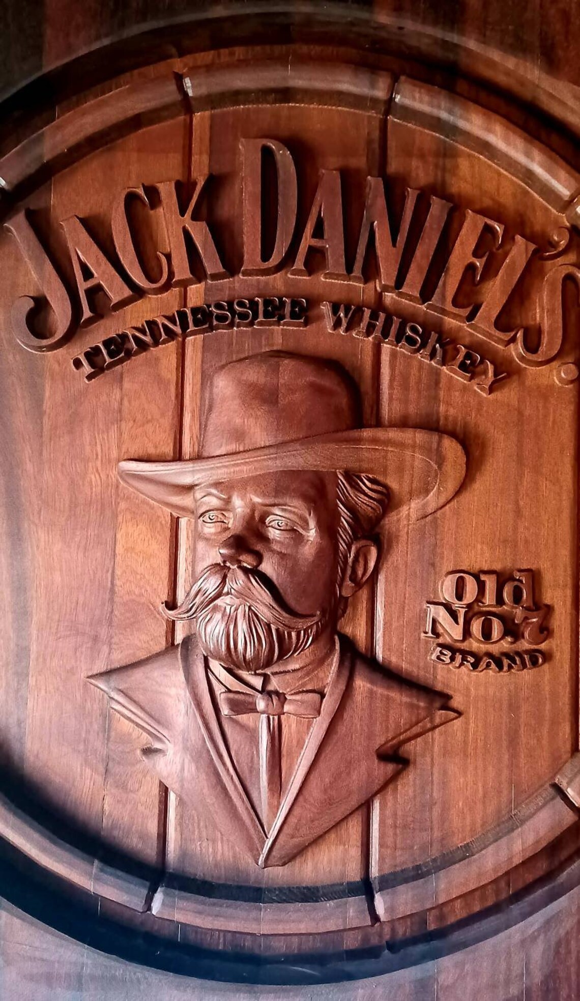 Peça decorativa em madeira com relevo artístico, inspirada no estilo clássico do universo Jack Daniel’s.
