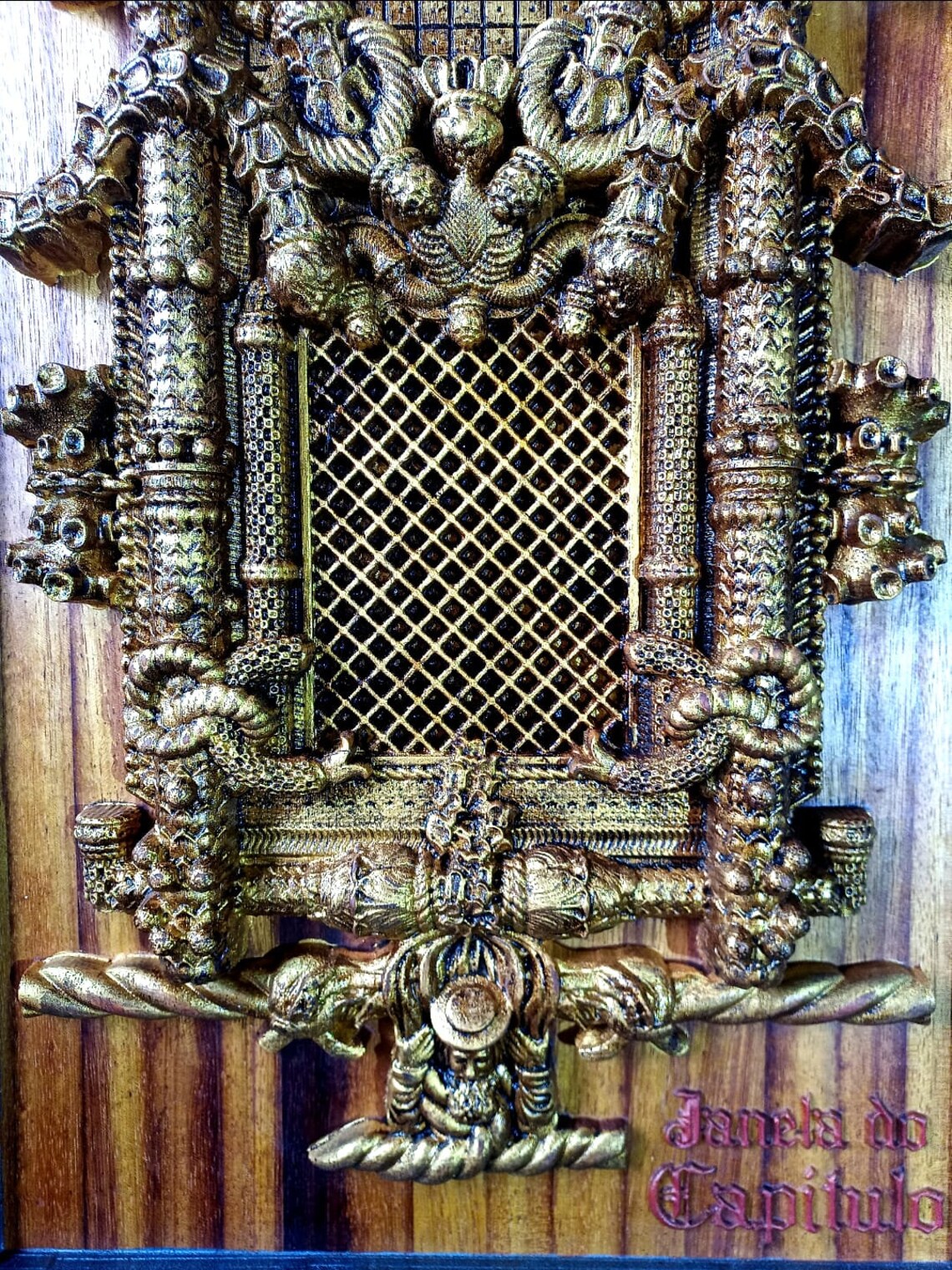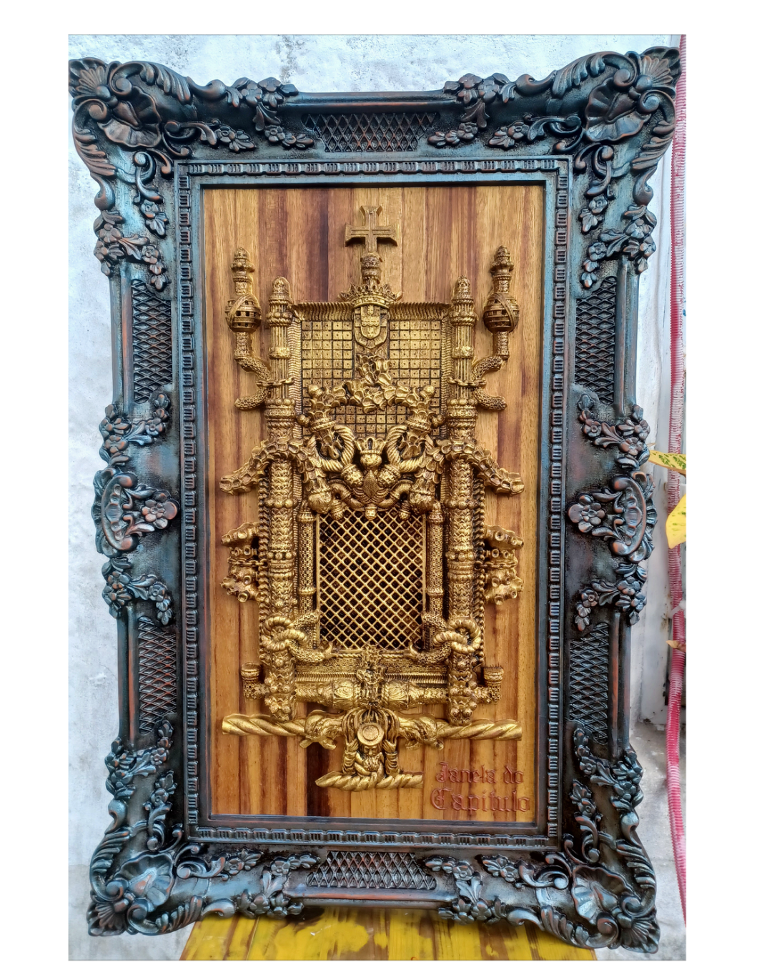 Janela manuelina do Convento de Cristo esculpida em madeira de Kambala. Obra em relevo com moldura integrada. Edição limitada com certificado.