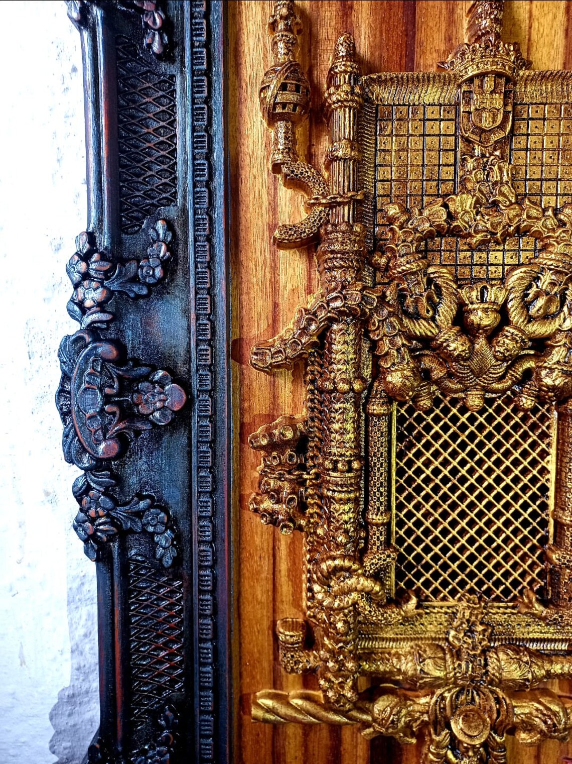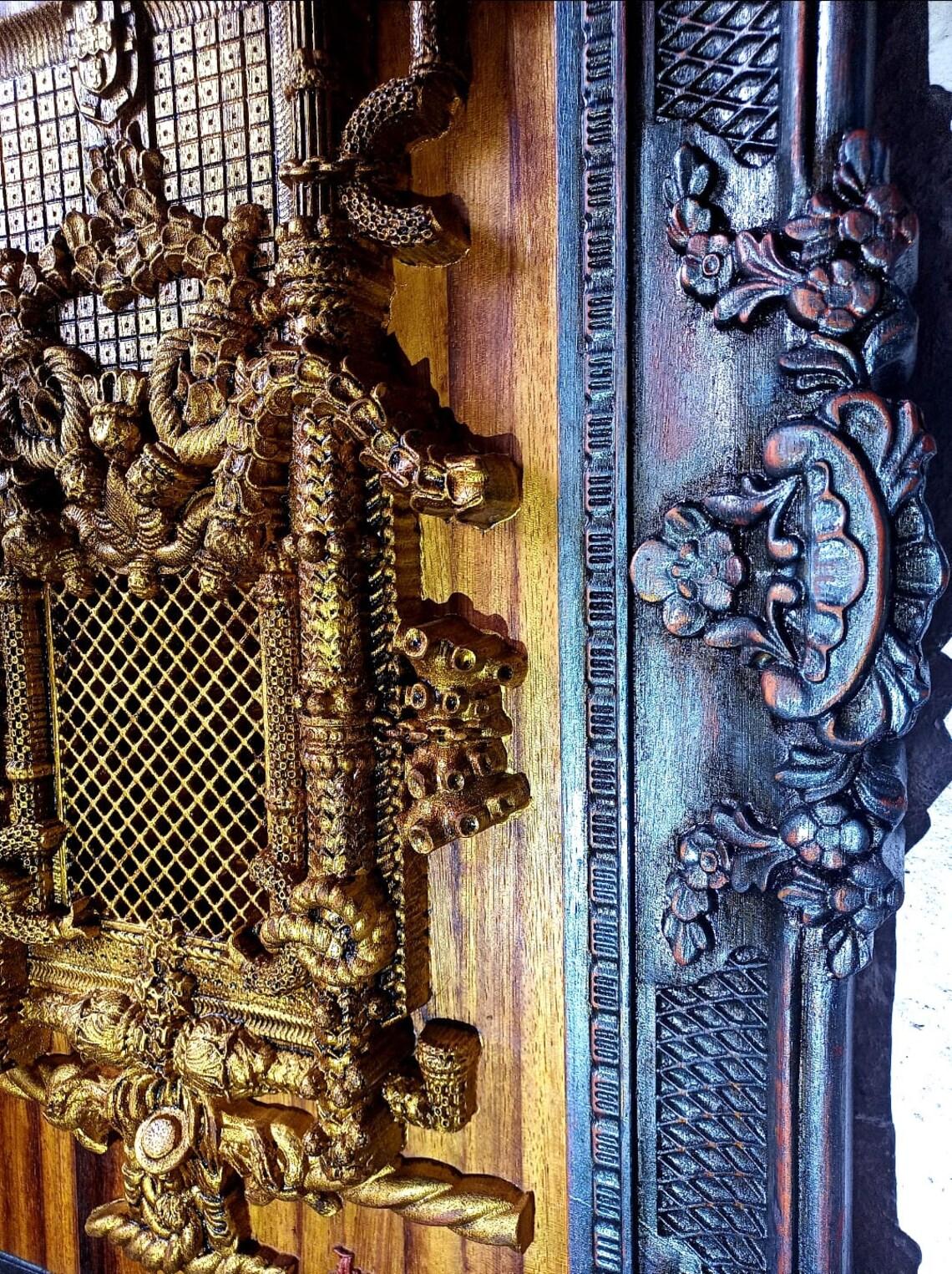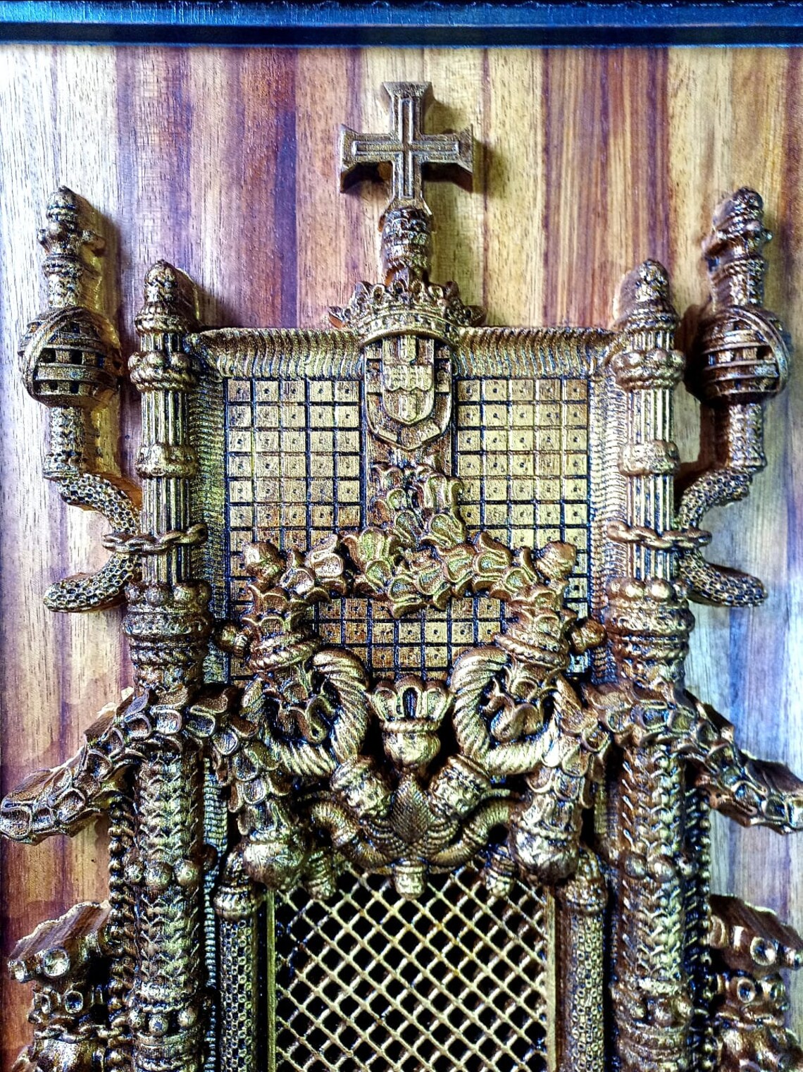 A peça é esculpida em madeira de Kambala africana centenária, com todos os elementos em relevo — cordas, cruzes, colunas e detalhes simbólicos — talhados com precisão e respeito pelo estilo original do século XVI.