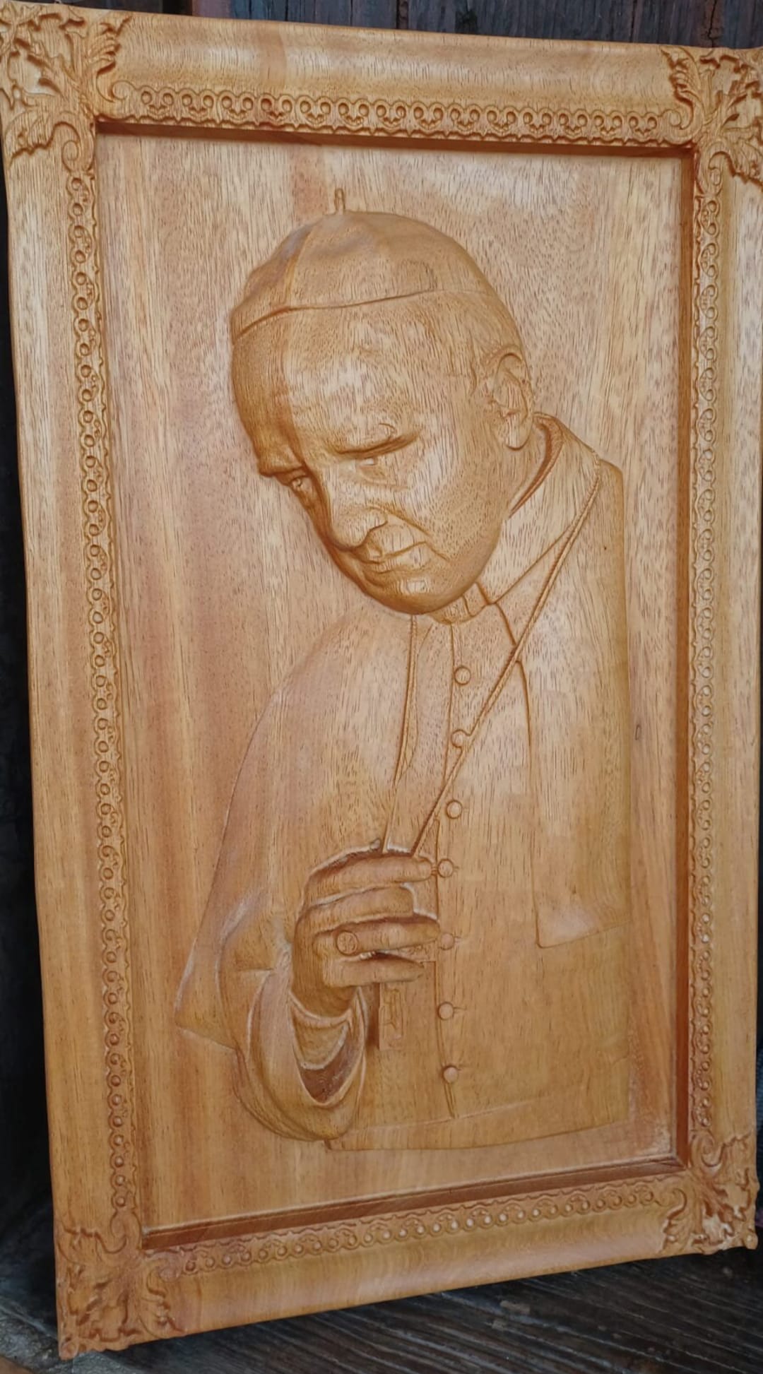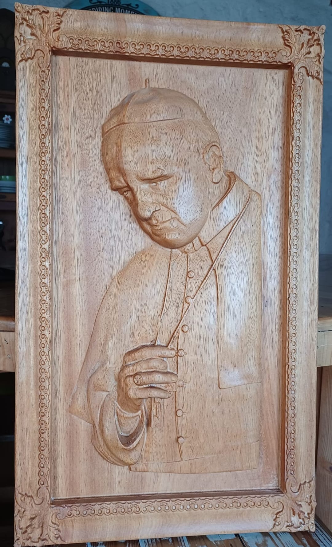A presente obra é composta por um quadro representativo de Sua Santidade, o Papa Francisco, esculpido integralmente em madeira exótica — uma essência africana de grande nobreza e resistência.
