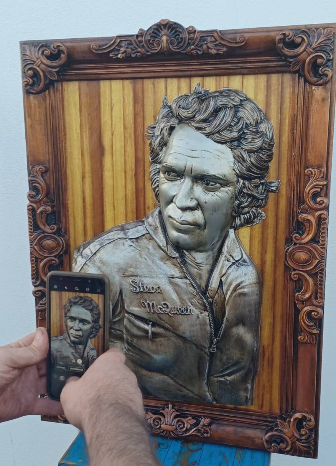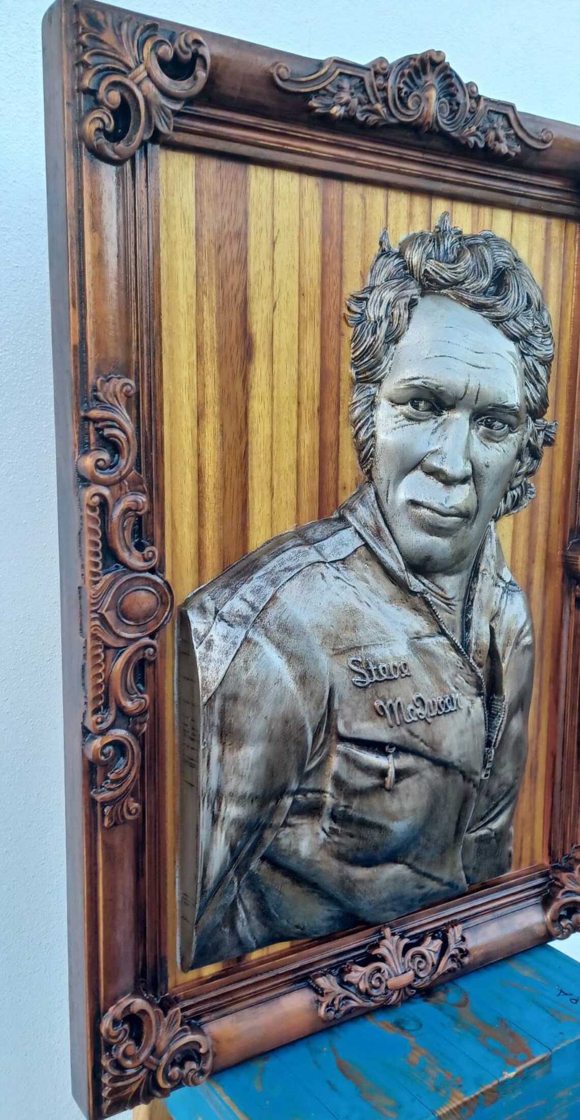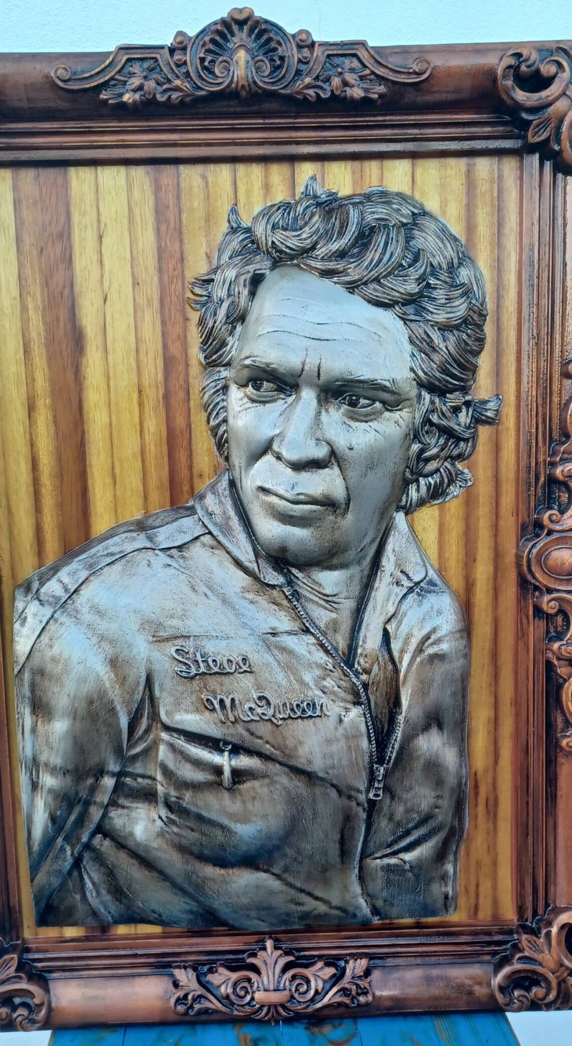 Representado com o olhar marcante que o eternizou, Steve McQueen ganha vida nesta escultura em madeira de Kambala africana centenária. Cada traço foi esculpido em relevo com precisão, incluindo a moldura — trabalhada na mesma peça de madeira, conferindo uma presença única e imponente.