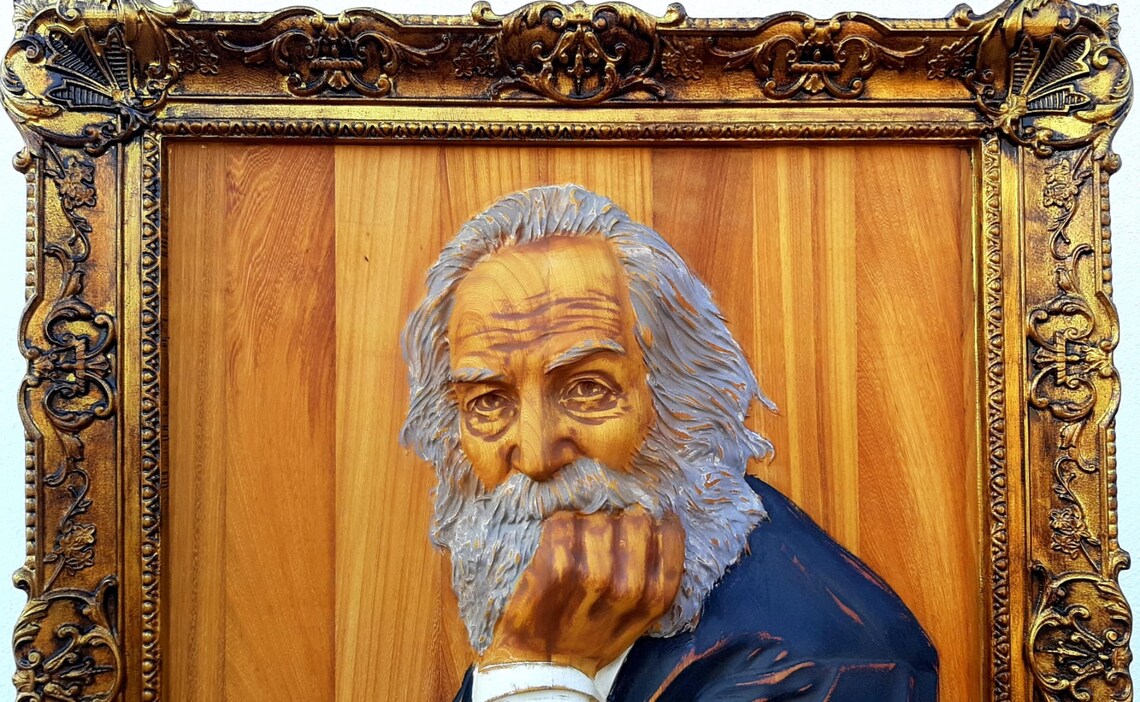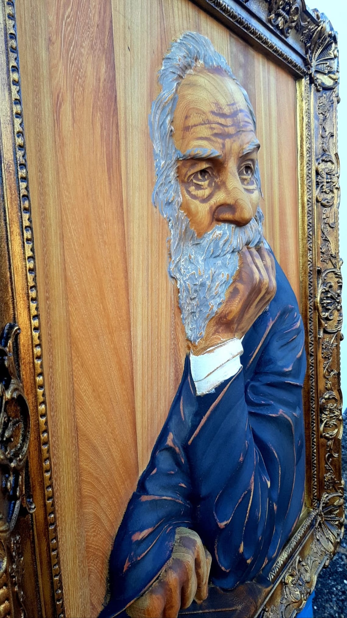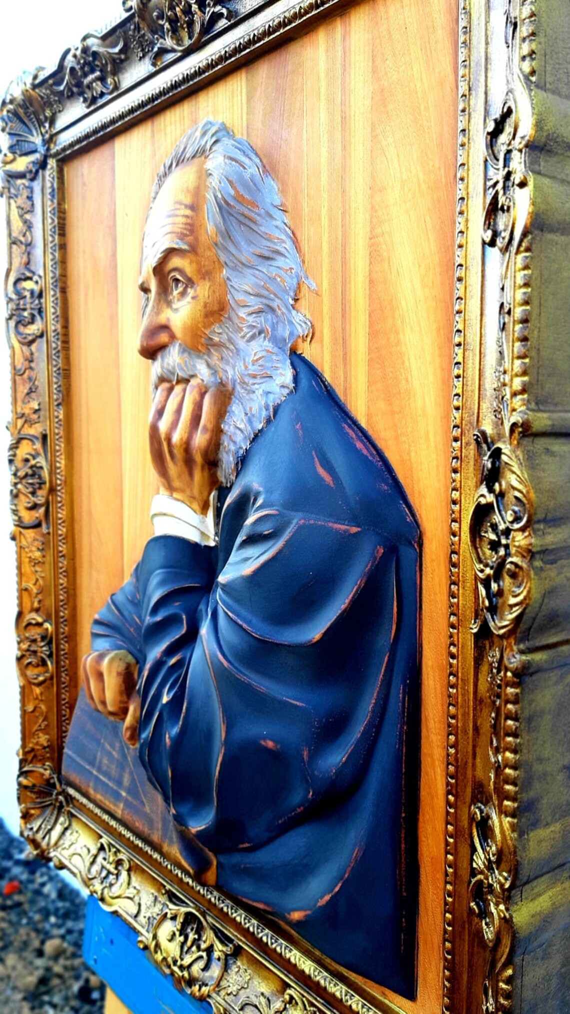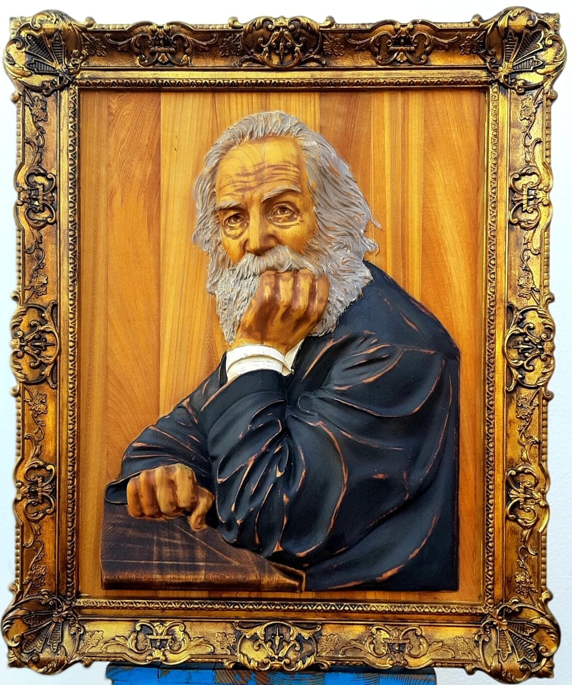 Escultura Walt Whitman em madeira exótica, com moldura integrada. Edição limitada.